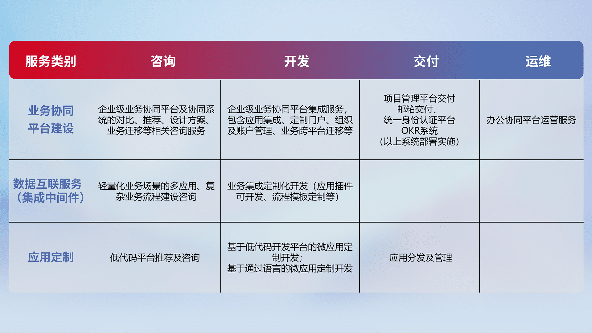 针对钉钉、、、企微、、、、IDaas等平台级产品提供产品的规划、、方案、、交付、、、、定制化开发等服务,,实现如统一协同办公、、智能客户服务、、、、混合会议管理、、智能数据查询、、、、等业务场景,,,,实现数字化转型。。。